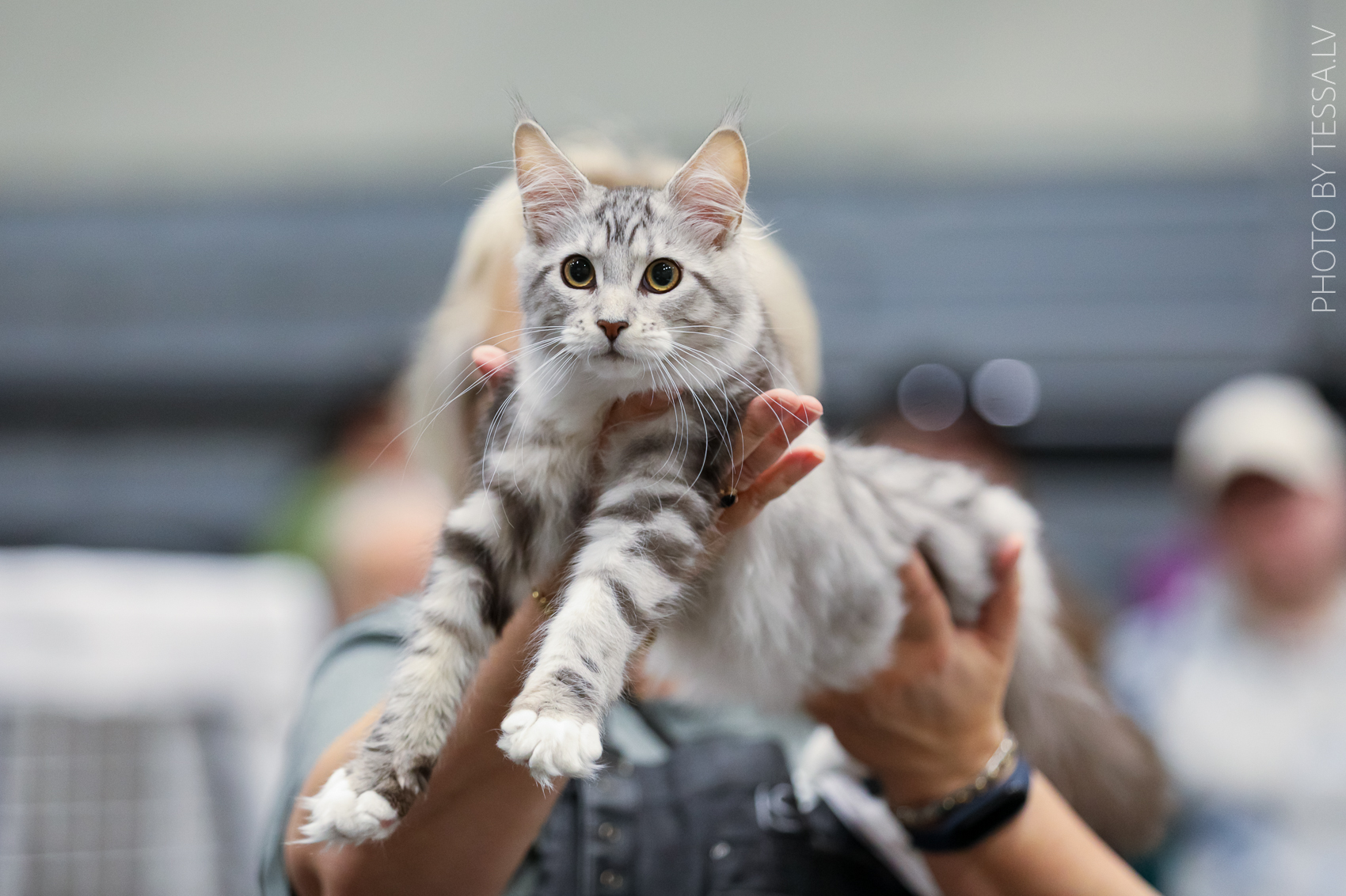 Our female kitten FI* Moggi Silver Pearl in her first show CACC, BIVtot / CACC, BIVtot, NOM. These pictures are by TESSA from the Best in Show panel. Congratulations Sinna, such a lovely presentation to Deva at her first show.