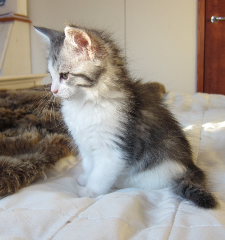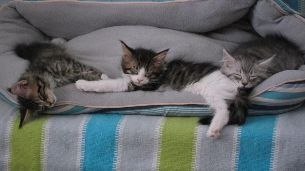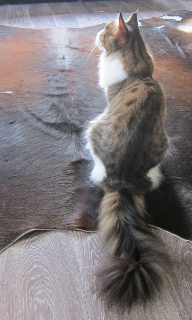 Korppu oli Ex 2, ei sertiä. Toinen saman väriryhmän narttu oli tuomarien mielestä tasapainoisempi tuolloin, mikä on totta, ja se sai sertin. Jotkut kasvavat tasaisesti, kun toisilla tulee ensin jalkaa, päätä, häntää. Itse pidämme Korppua huikeana. Glemin välitön komentti oli ”This is a bulldog”. I tought it’s Maine Coon 😉 . Teinimorfoosissaan Korpulla on pää suhteessa kroppaan vielä keskenkasvuinen, mutta sen runko on täydellinen ja kookas. Jotain villiä siinä on, mutta samalla se on ihana sylikissa, halipallo kuten siskonsakin.