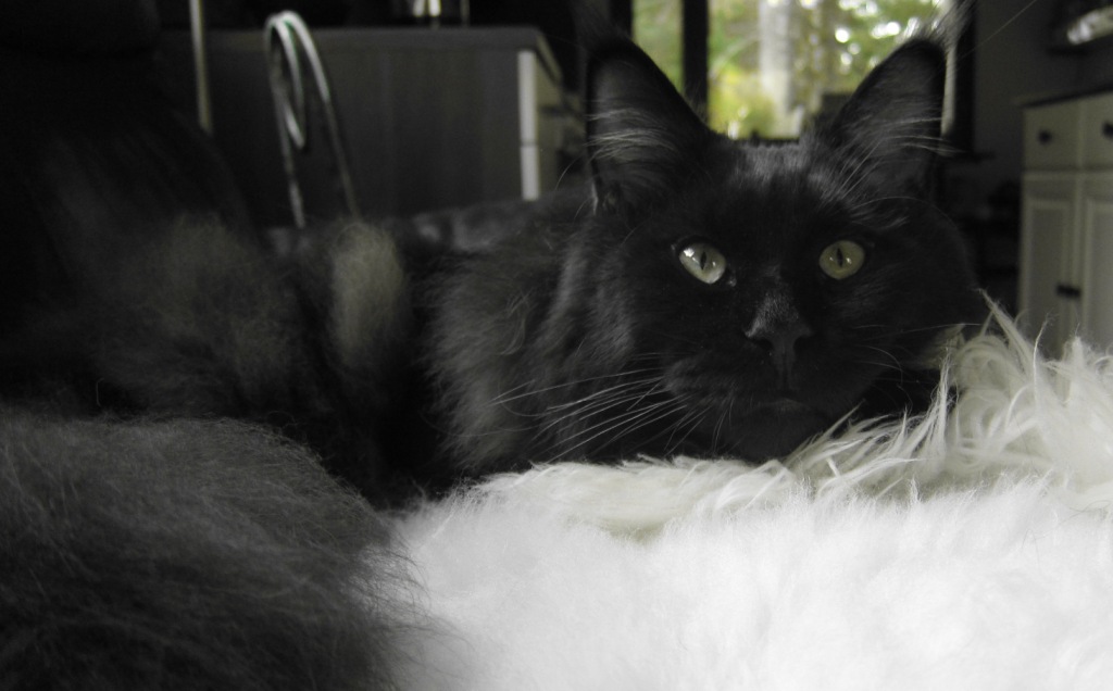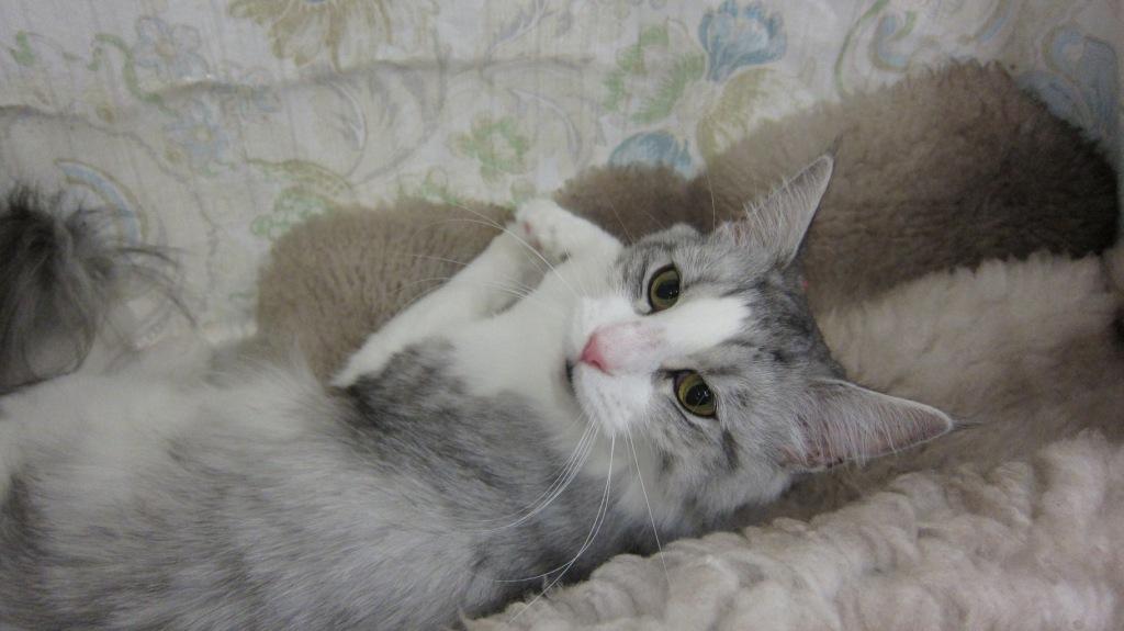 Korppu sai mukaansa kaksi sertiä. Korpulla edelleenkin karva on lyhyt cooniladyksi, mutta neitosen koko ja täydellinen kroppa korvaa puutteita karvan pituudessa. Koon lisäksi väri sai erityistä kiitosta ja silmät. Korpustakaan minulla ei ole kuvaa Lapualta. Tätä kissaa on helppo esittää, ennemmin väsyy itsellä kädet kuin kissa.